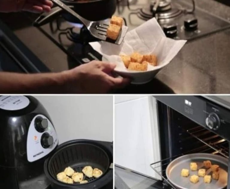 Nossos dadinhos podem ser feitos fritos, no air fryer ou no forno. No verso das embalagens você encontra o modo de preparo detalhado, para cada tipo de preparação.